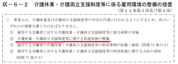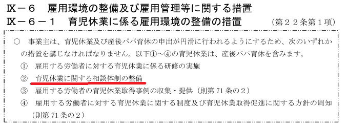 (相談窓口の設置)があげられますが、複雑でかつ改正が何度も行われる育児休業や